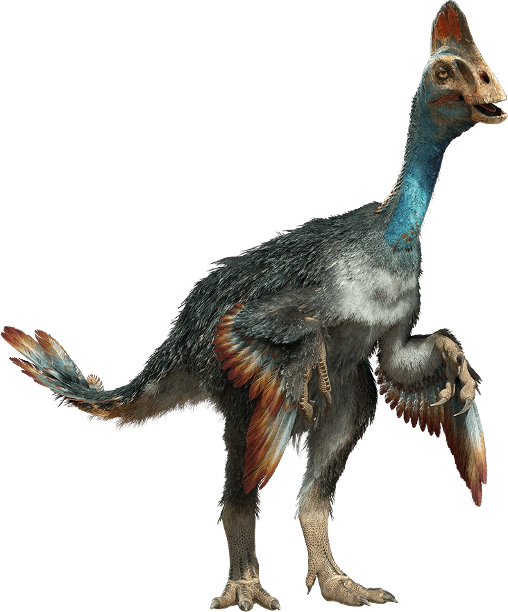 This Oviraptor American that eats plants and small animals and, because of the crest on its head, it looks like the new cassowary Zélande. It has eyes indicating that they are nocturnal and his clawed hands allows him to catch His food and his feathers, for the love parade.